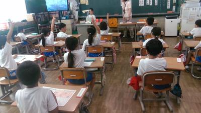 昨日24日の2校時に校内研修の一環で1の2の公開授業が行われました。国語の「知らせたいな、見せたいな」という教材で子供たちがサファリの動物園で発見したことを友達と伝え合う授業でした。