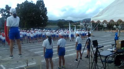 今日の朝行事は運動会のラジオ体操の練習でした。代表の子供が朝礼台の上で模範演技をし、1つずつやり方を確認しました。
