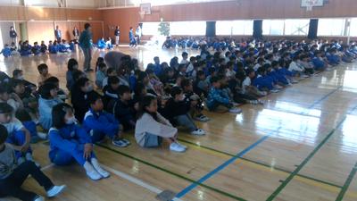 今日の朝行事は児童集会で、体育館で後期の委員会紹介がありました。