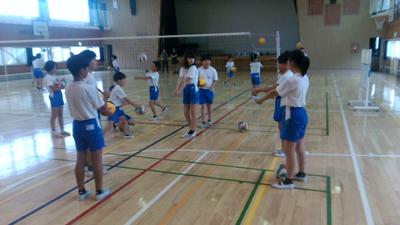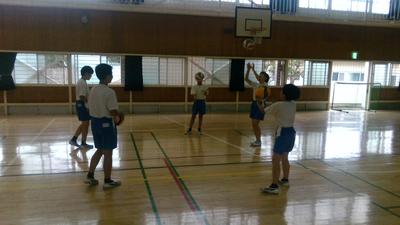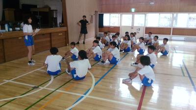 最初に前回行ったことの確認をして、今日は準備体操の仕方を行いました。体育委員が模範演技を行い、実際にみんなでやってみました。
