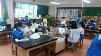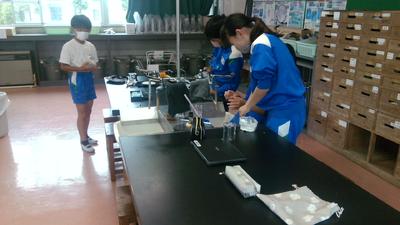 理科室で6の1の子どもたちがビニル袋を膨らませて何かの実験をしていました。