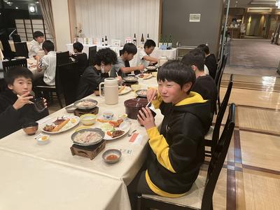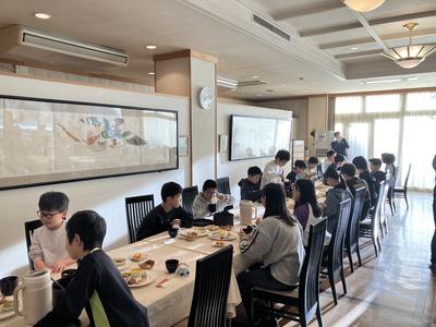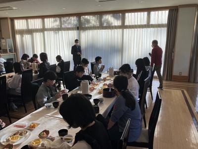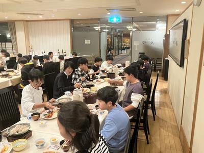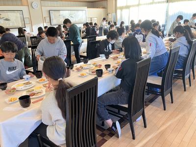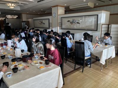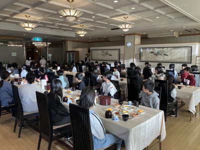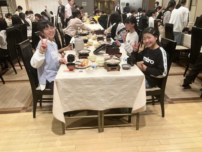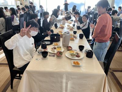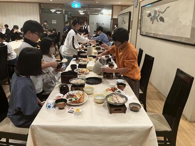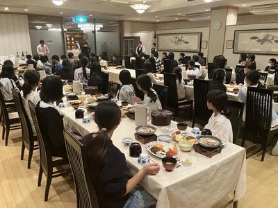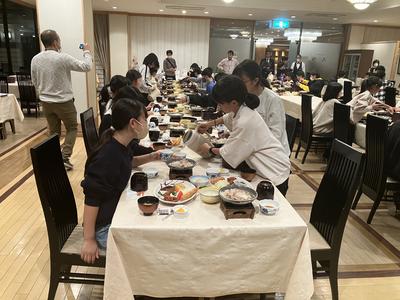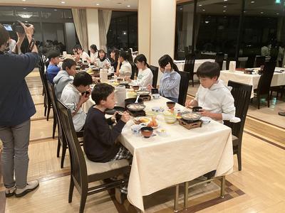 これからみんなで食事です。学級代表の挨拶で食事が始まりました。