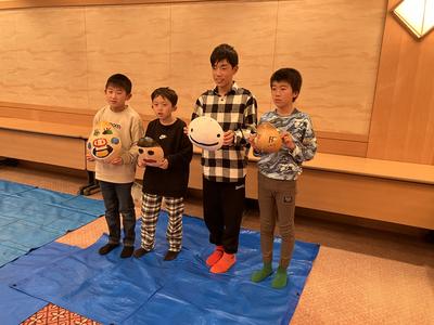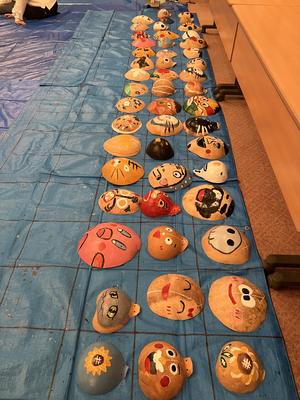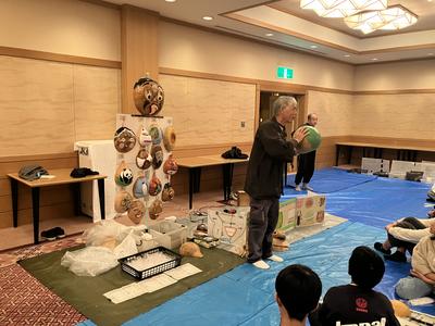 夕食後、ホールでふくべ細工の体験をしました。ふくべとは夕顔の果肉のことで、それを乾燥させて作ったお面のようなものをふくべ細工というのだそうです。最初に作り方について説明していただきました。