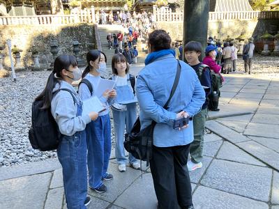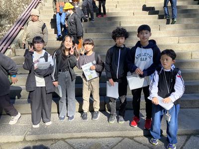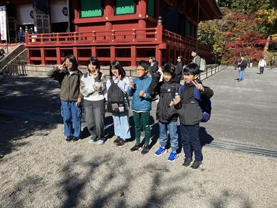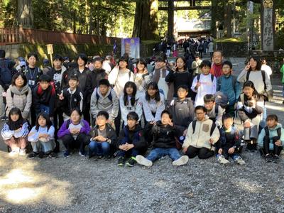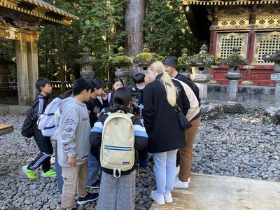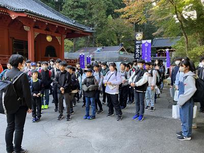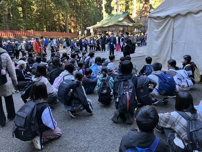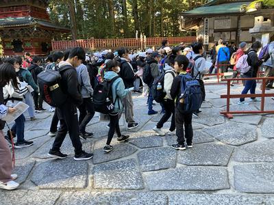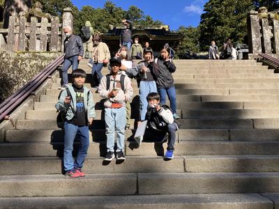 東照宮に到着して、記念写真を撮りました。とても混んでいます。外国の方とコミュニケーション取るために、友達同士で聞き方を確認している子供もいました。