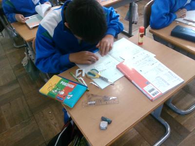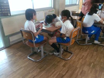 2の2の教室で子供たちが「難しい」と言いながら、一生懸命ノートに何か書いていました。