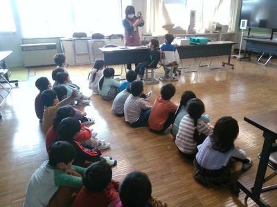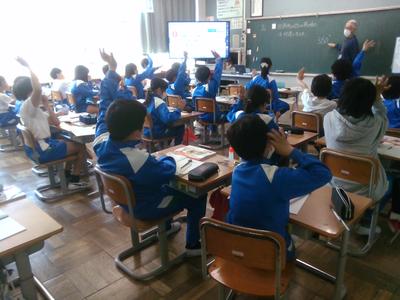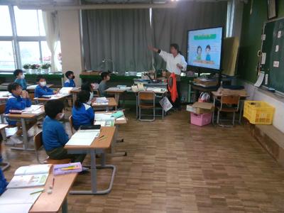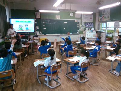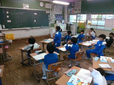 1の1の教室で子供たちが「手のひらを太陽に」の曲を楽しそうに口ずさんでいました。