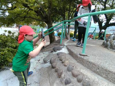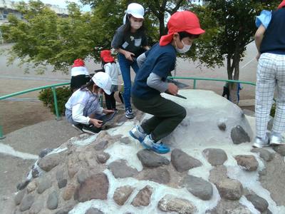 大きさを確認するために、自分の手を生き物と一緒に撮影している子供もいて感心しました。子どもたちは校庭いっぱいに散らばってたくさんの生き物を見つけました。