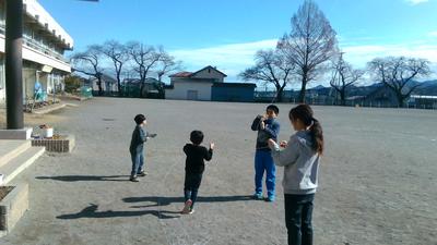 校庭で1年生の子供たちが、楽しそうに凧あげをしていました。生活科の「ふゆをたのしもう」という単元で、一人ひとり凧を作り、上げていました。紐が絡まってしまうと友だちと協力してほどき、繰り返し凧あげを楽しんでいました。