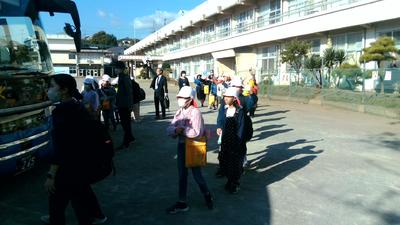 今日から6年生が1泊2日の修学旅行にでかけます。出発式が終わり、2台のバスで足利学校に向かいます。