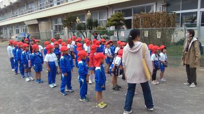 今日の1,2時間目は低学年の試走でした。コースだけでなく走る順や待機場所等も当日を意識して行われました。最初に合同の準備体操をしました。