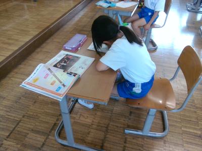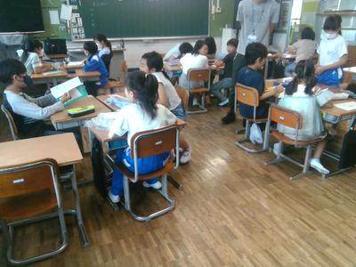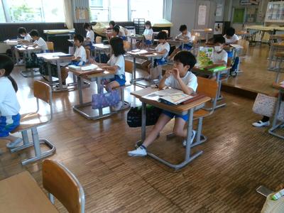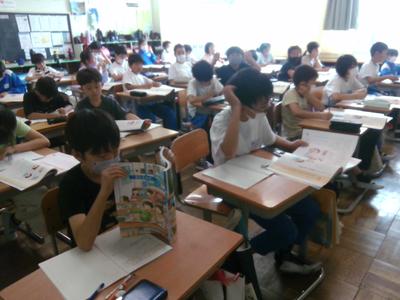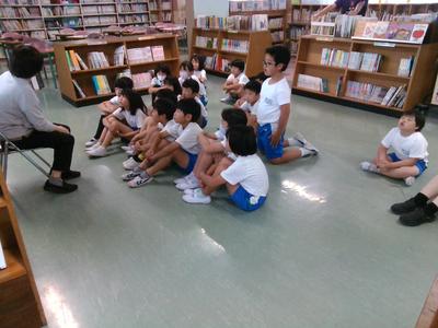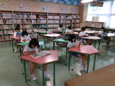 3の1の子供たちが図書室で何か一点を見つめていました。