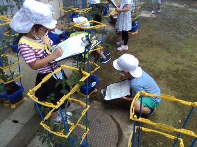 脇芽を積むなど世話をしながら、葉や茎、実の細かい成長の様子について観察し記録していました。