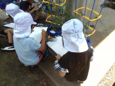 4年生の理科では、「季節と生物」という単元で、年間を通して季節ごとの動植物を観察し、その変化の様子から成長と環境の関係について考える学習をしています。4の2の子供たちは夏の様子を観察しているところでした。