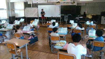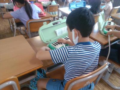 置き方から長いうたくちの扱い方、指の置き方など一つ一つ指導していただきました。初めての鍵盤ハーモニカに子供たちは興味津々で、音が出たときにはとても喜んでいました。聞き方も上手で、鍵盤ハーモニカの授業が楽しみになりました。