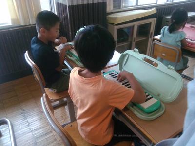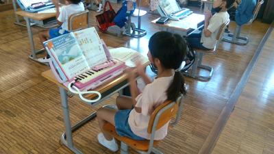 単元の終わりには、鍵盤ハーモニカで演奏することを目標にしています。鍵盤ハーモニカの吹き方も確認し、「ぷっかりくじら」をリズムよく楽しそうに歌っていました。