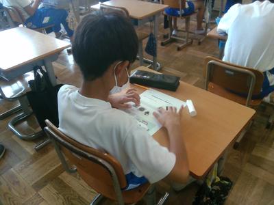 3年生の音楽では、リコーダーの学習を行います。今日は最初の時間なので、リコーダのーの音色を聞いて感じたことをワークシートに書き込む時間でした。一人ひとりリコーダーのもつ独特の音色やリズム、旋律に着目しながら興味深くじっと聴いて感じたことを書いていました