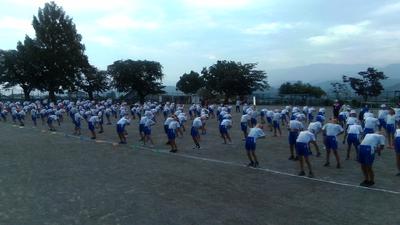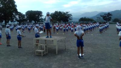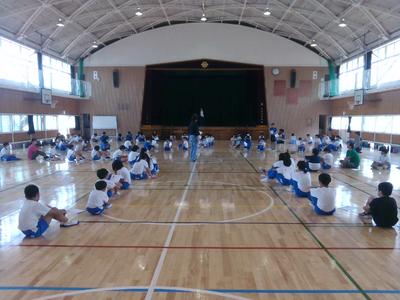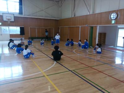 今日の朝行事は2回目の体育集会でした。始まる2分前に全員が集合し、担当から褒められました。