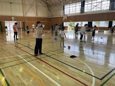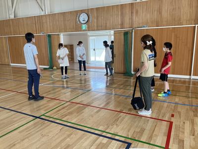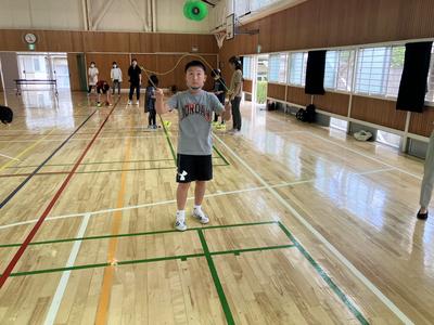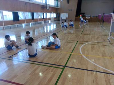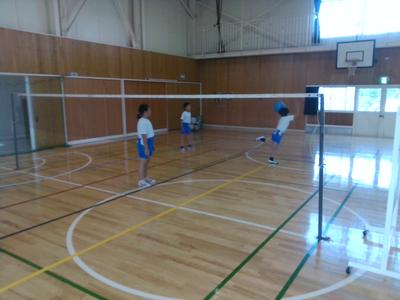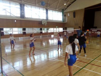 掛け声をどんなふうにしようか、作戦をどうしようか話し合っていました。実際にコートに入って打つ演習をしました。声を掛け合いながらみんなで決めたルールにしたがい、楽しくプレーしていました。