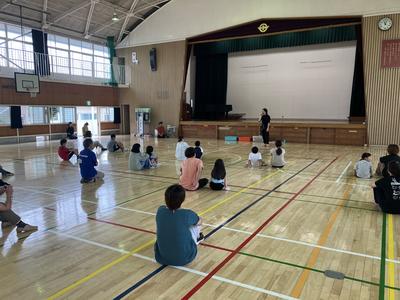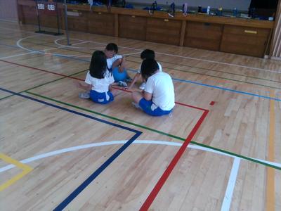 体育館で子供たちがチームに分かれて何やら相談をしていました。