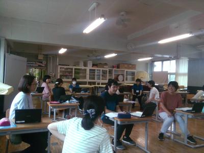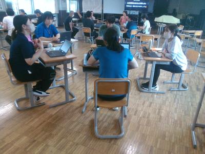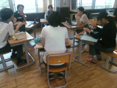 子供たちの様子や、自分の授業の様子を話しながら、どのようにしたらうまくいくのか真剣に考えていました。教員の経験や立場は様々ですが、子供たちへの思いは皆一緒で、みな熱く語りながら有意義な研修となりました。