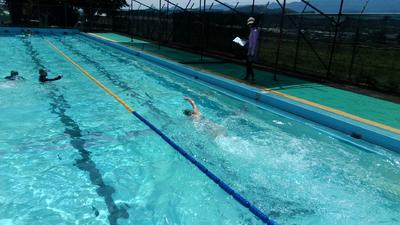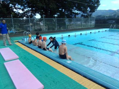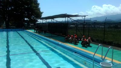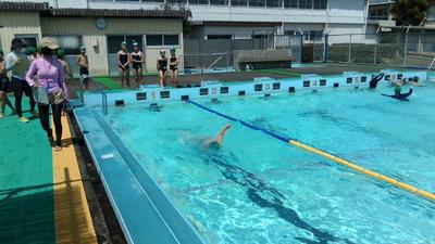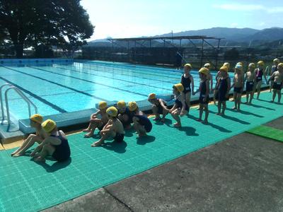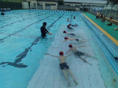 け伸びやバタ足での泳ぎも確認しました。水の中のほうが温かいくらいの陽気でしたが、子供たちはキビキビと動き、楽しく水泳に参加していました。