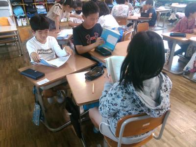グループに分かれてお互いのノートを見せ合い、良いところを確認しあっていました。また、よくできいる友達のノートを見て、自分の家庭学習に取り入れようとしている子供もいました。