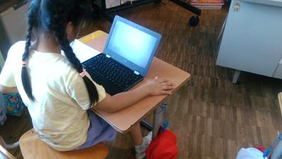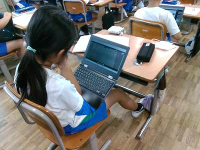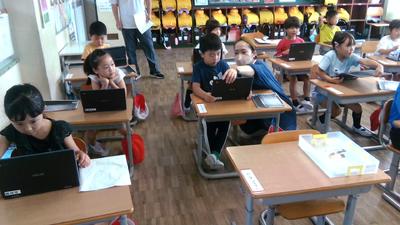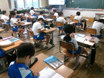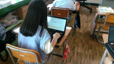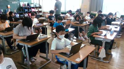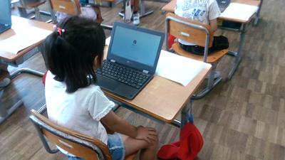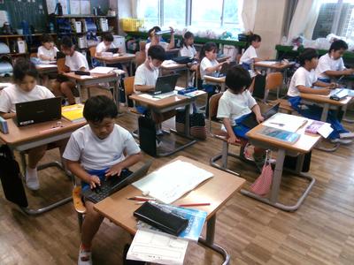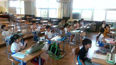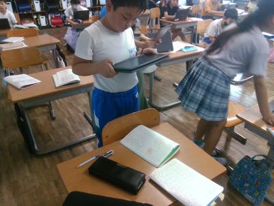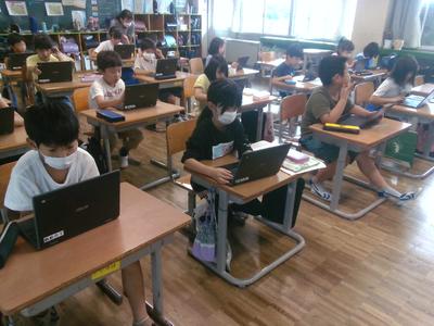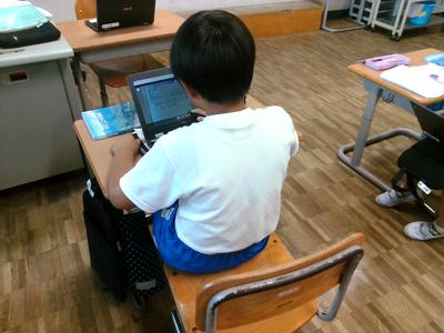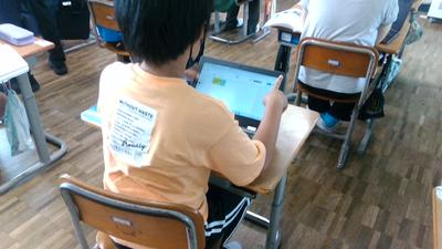 4年生の教室の前を通ると、どちらのクラスも子供たちがタブレットに向かって学習していました。
