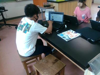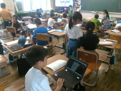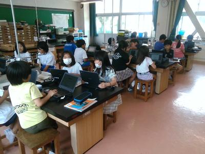 理科室に戻ってみると、子供たちがタブレットに向かい、作業しながらグループで話し合っていました。