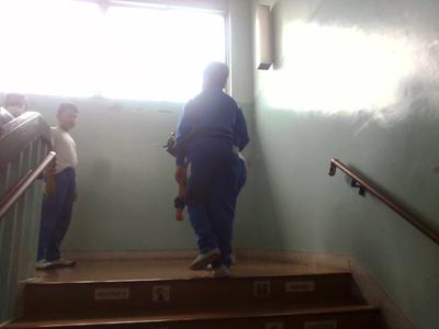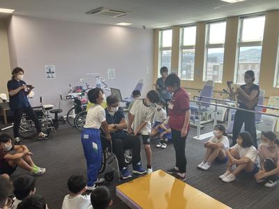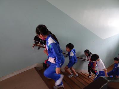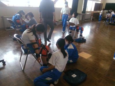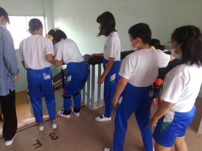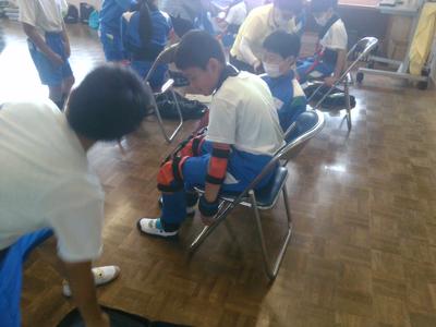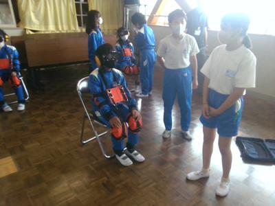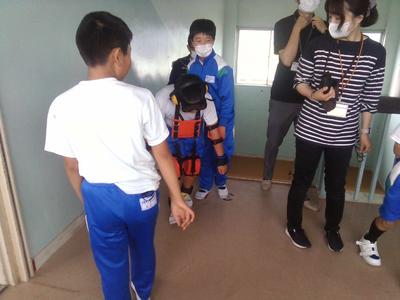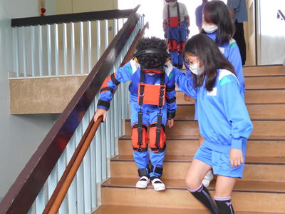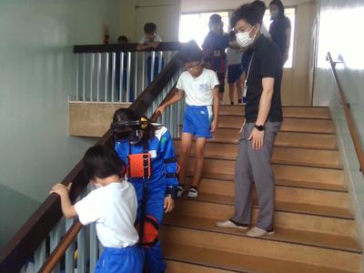 次に、実際に高齢者の装具を付けた子供が階段を上り下りし、回りで二人が介護する体験もしました。