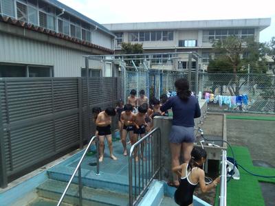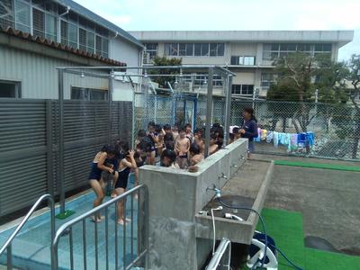 3,4校時は2年生が今シーズン初めてプールに入りました。足洗い場を通り、冷たいシャワーを浴びる時には思わず歓声が上がりました。