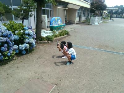 校庭で子供たちがタブレットを使って植物を撮影していました。