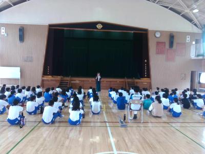 今回のスローガンは「みんなが助け合い、笑顔あふれる宮小っ子」です。みんなで助け合って笑顔いっぱいの一ノ宮小にしましょう、という呼びかけがありました。その後校長からは、谷川俊太郎の詩の絵本「ともだち」を読み聞かせし、友達とはなんだろう、人と人がうまく付き合うにはどうしたらいいだろうということについて考えていこう、と投げかけました。