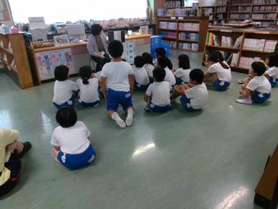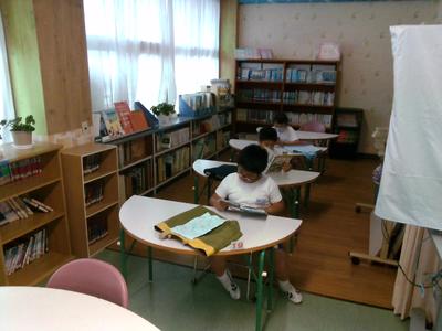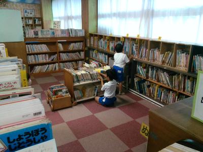 図書室で図書の先生が読み聞かせをしていました。外は雨が激しく降っていて、読んでいた本の題名は「あらしのよるに」。雨音とリンクしながらの読み聞かせに、子供たちは「あーっ!」とか歓声をあげながら聞き入っていました。