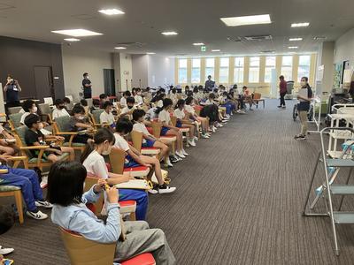 ハッピーセンター縁に到着し、最初にお話を聞きました。高齢者に接する時には、明るく笑顔で話すことや、家族と同様な気持ちで親切に接することなど学びました。子供たちはメモをとりながら聞いていました。