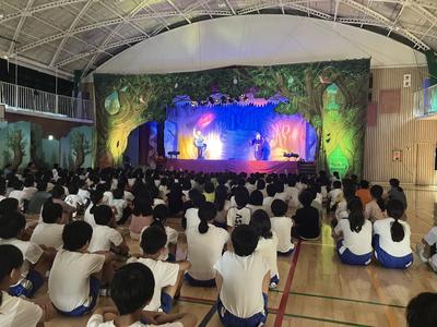今日の5,6校時に開校150周年記念行事として、劇団「青い鳥」によるミュージカル「アーサーと王様の剣」というタイトルのミュージカルを全校で鑑賞しました。