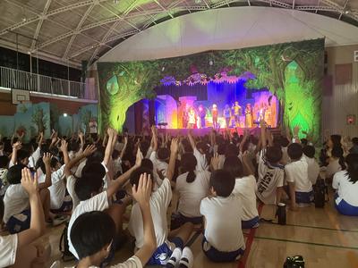 午前中から準備が始まり、舞台装置も本格的で、劇場にいる雰囲気で見られました。笑いあり、感動あり、ドキドキする場面ありであっという間の80分でした。全員でお礼をいい、いつまでも手を振りながら終わりになりました。