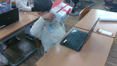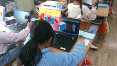 1年生の図工で箱の形や色を活かして、大切なものを入れるボックスを作りました。今日はみんなで鑑賞するために、タブレットを使って準備をしているところでした。