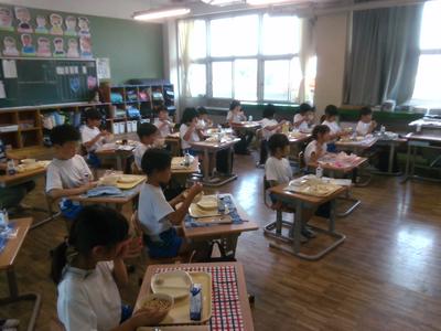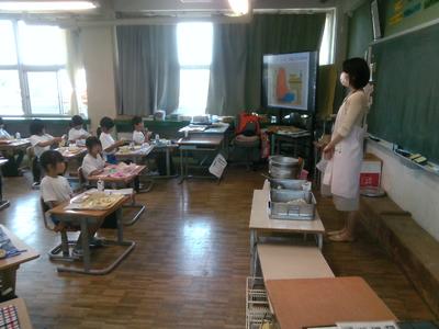 今日の給食の時間に、給食センターより福永栄養教諭、宮崎栄養士をお招きし、食事のマナーについてお反しをしていただきました。