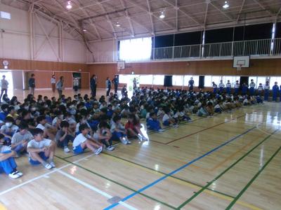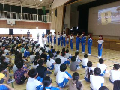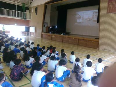 低学年の歩行訓練に引き続いて、降雨のため体育館で交通安全教室を全校で行いました。