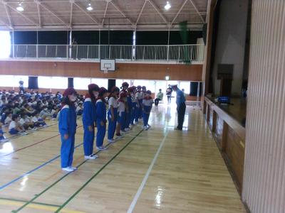 最初に交通少年団認証式がありました。5,6年生の有志が積極的に引き受け式に臨みました。交通指導員さんより認証書が授与され、交通安全の誓いを行いました。
