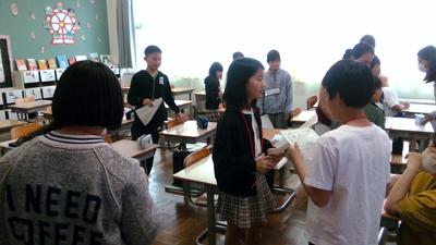「自分の好きなものや好きなことを伝え合おう」というテーマで、友達と好きなものや好きなことの情報を交換しているところでした。ALTにも相談しながら言い方や表し方を考えていました。