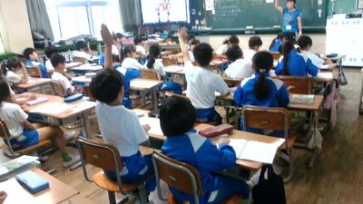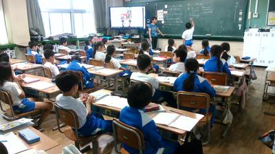 3の1の教室で、黒板の前で説明している子供がいて、周りの子供たちはそれを聞きながら一生懸命考えていました。