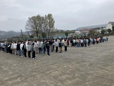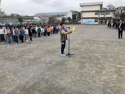 子どもたちは5分前に集合し、代表の児童が今年度の抱負を堂々と述べました。校長からは、今年は「伝える」をテーマとし、伝統ある一ノ宮小の節目の年、希望に満ちた新たな小学校開校に向けて、良き伝統をさくら小に伝えていこうという話をしました。さらに、自分の気持や友達の気持ちを考え、授業や生活の中で周りに伝えられる人になろう、1学期は「挨拶」に取り組もう、という話をしました。
