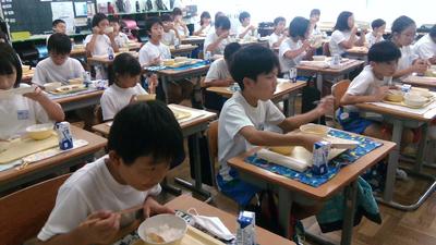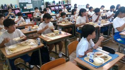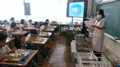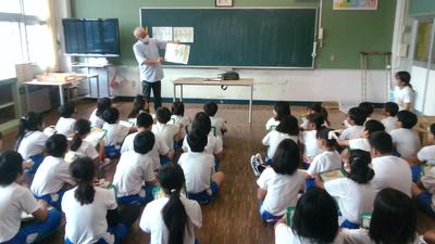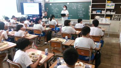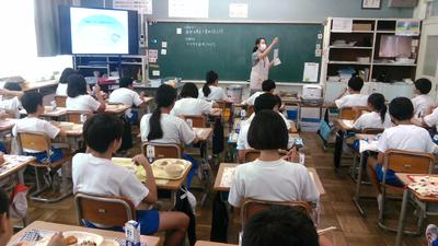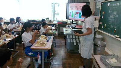 今日の給食の時間に給食センターより2名の栄養士の方がみえて、「地域で採れる野菜を知ろう」というテーマでお話をしていただきました。給食センター作成の野菜のキャラクターを子供たちはよく分かっていて、今日の給食には「コマツリーナ」が入っていることを知っていました。