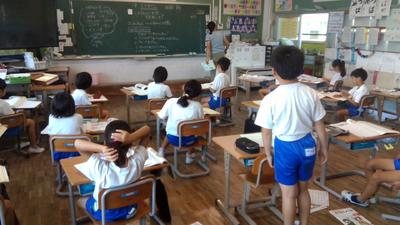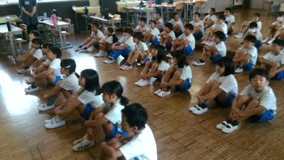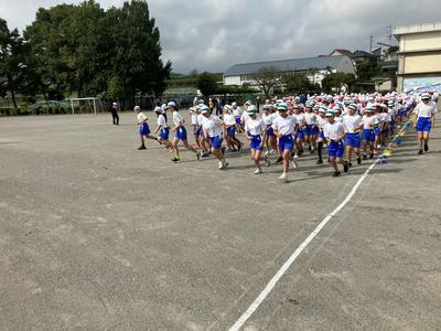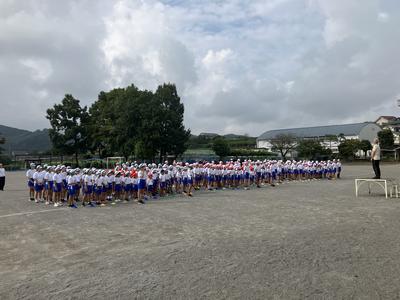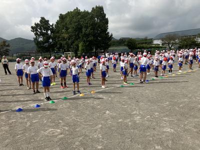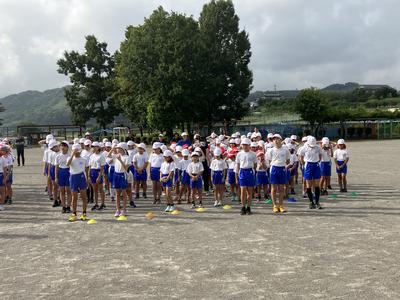 今日の朝行事は初めての運動会の全体練習でした。並び方や服装の確認、姿勢や体操の体形に移動する練習をしました。