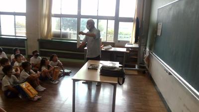 幼稚園の頃に育てた経験のある子供もいて、説明や質問に積極的に答えながら熱心に聞いていました。今後、カイコを育て、繭になるのを観察し、座繰り体験まで行う予定です。
