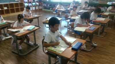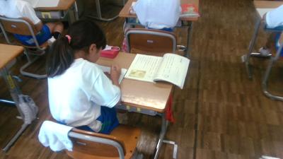 「お手紙」という物語文の学習をしています。登場人物のがまくんとかえるくんの気持ちを読み取り、最終的に音読劇をすることを目標にしています。今日は読み取りのめあて作りを学級全体で行っていました。一人ひとりが音読したいところを探しながら、登場人物の気持ちを考えていました。