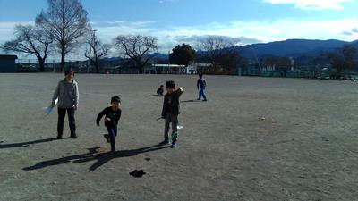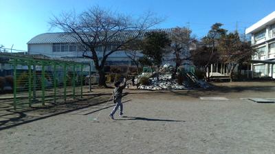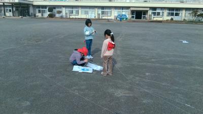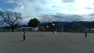 校庭で1年生の子供たちが、楽しそうに凧あげをしていました。生活科の「ふゆをたのしもう」という単元で、一人ひとり凧を作り、上げていました。紐が絡まってしまうと友だちと協力してほどき、繰り返し凧あげを楽しんでいました。