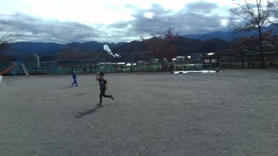 校庭から楽しそうな声が聞こえてきました。行ってみるとゆめそら組の子供たちが自分で作った紙飛行機や凧で遊んでいました。