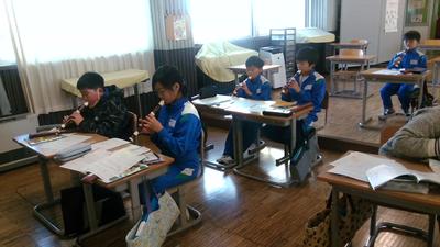 音楽室からリコーダーの音が聞こえてきました。子供たちがグループになって一生懸命練習していました。